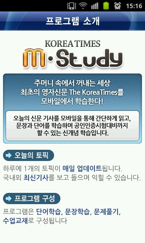 일반 기사에서 얻을 수 없는 특정 이슈에 대한 깊이 있는 정보가 논리 정연하게 담겨 있는 고급영어를 영자신문 사설을 통해 체득할 수 있습니다.All about learning English newspaper ***, KoreaTimes M-Study M. The Korea Times as one study is enough! ***