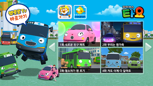 버스 친구들인 가니, 라니, 로기 그리고 다양한 자동차 친구들과 함께 멋진 시내버스로 활약하는 타요의 이야기를 앱으로 감상해 보세요.