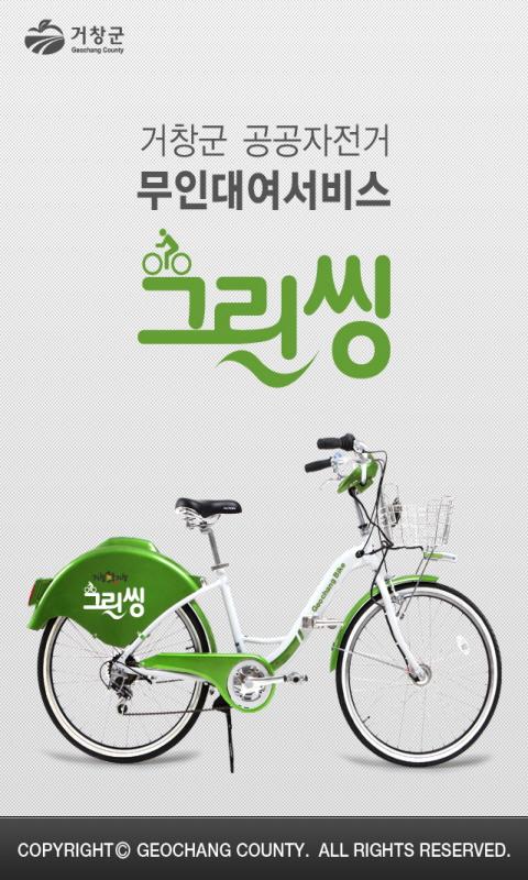 그린씽 스마트폰 어플리케이션은 언제 어디서나 스마트 폰을 이용하여 그린씽 자전거를 편리하게 대여할 수 있는 거창군민 자전거 전용 어플리케이션입니다.