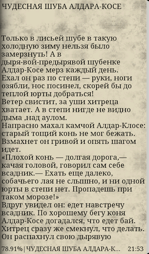 Tales - a wonderful example of the oral poetry of the Kazakh people, the pages of his stories that reflect the life, customs, manners and traditions of the steppe nomad enclosing the precious pearls of folk wisdom, wit, ingenuity, psychic schedrosti.My learn from them about the plight of the people and overwork about his age-old hatred of their oppressors, the heroic struggle against foreign invaders. In all fairy tales ridiculed stupidity, greed and boundless greed bais, famed for wisdom, heroism and simplicity of the poor. And always good triumphs over evil and the triumph of justice and always true. There's a lot of humor, biting sarcasm, fantazii.Kazahskie tales expressive, concise, read with great interest.