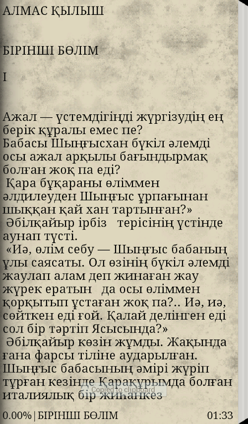 Первая книга трилогии «Кочевники» казахского писателя Ильяса Есенберлина. Это — широкое эпическое полотно, воссоздающее историю казахского народа, начиная с XV века и кончая серединой девятнадцатого столетия.Іliyas Yesenberlin Kөshpendіler (Nomads) - Kazakh language