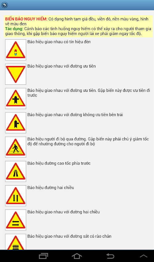 • Danh sách toàn bộ biển báo xuất hiện trong 450 câu hỏi của đề thi giúp bạn tham khảo nhanh các biển báo trong trường hợp cần thiết.