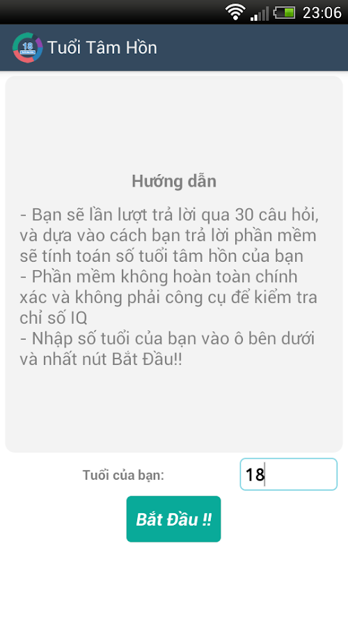 Phần mềm không hoàn toàn chính xác và nó không phải để đánh giá chỉ số IQ của bạnYou will answer consecutively through a series of questions, from how you answer the software will calculate the age of your respective soul, and let you know more or less old soul really how old age