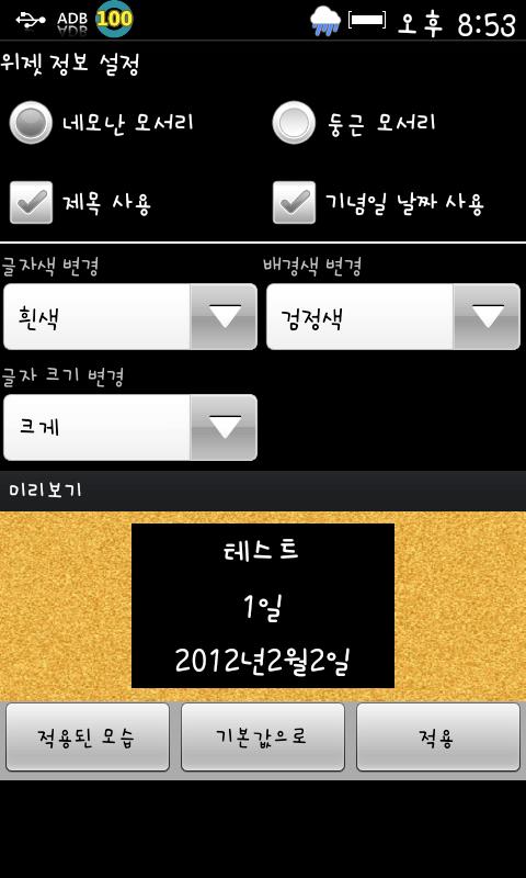 - 위젯환경설정에 기념일 리스트 보기 추가 - 사용자 정의 위젯에 네모난/둥근 모서리 가능 - 달력 이동시 애니메이션 효과