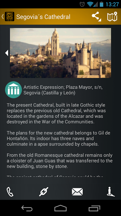 Through this application you can go into detail into Isabel La Católica´s Route in Castilla y León: learn about different artistic expressions related to the life of the queen, find out more about the historical events and contact to the tourism offices and museums. You can even filter the resources according its tipology or its location in the route. Similarly, you can position the different resources on a map or either display them via augmented reality. The information is complemented with different images of the resources that are exposed, in order to serve as a comprehensive and promotional tool for the towns included in the provinces of Avila, Segovia and Valladolid.