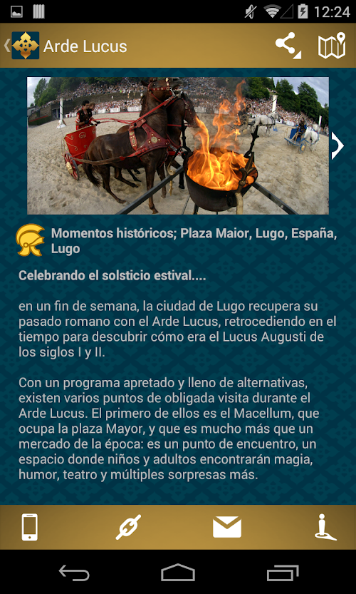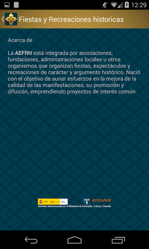 Con esta aplicación podrás conocer las fiestas y recreaciones históricas que existen en España. Tendrás a mano toda la información para organizar tu viaje y sumergirte de lleno en la historia, arte y folklore existentes en nuestro país. Tienes disponible cuándo y dónde y cómo llegar a cada fiesta histórica, datos de contacto, ficha técnica completa con información complementaria. Podrás filtrar todas las fiestas históricas por tipo, región geográfica, calcular tu ruta para saber cómo llegar y utilizar la Realidad Aumentada para obtener más información mediante la cámara de tu dispositivo móvil. Tendrás acceso a toda la información para que puedas disfrutar y recrearte en la historia de una manera diferente y divertida.With this application you can find festivals and historical recreations that exist in Spain. You will have to hand all the information to organize your trip and immerse yourself in the history, art and folklore existing in our country. Have available when and where and how to reach the historic party, contact information, complete technique with additional information. You can filter all historical celebrations by type, geographic region, calculate your route to get directions and use Augmented Reality for details using the camera on your mobile device. You will have access to all the information so you can enjoy and recreate the story of a different and fun way.