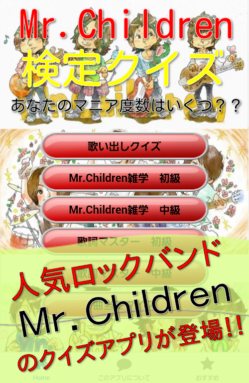 人気ロックバンド、Mr.Children(ミスターチルドレン)のクイズ(検定)アプリです。
