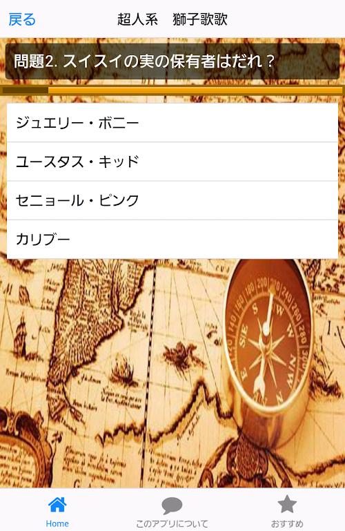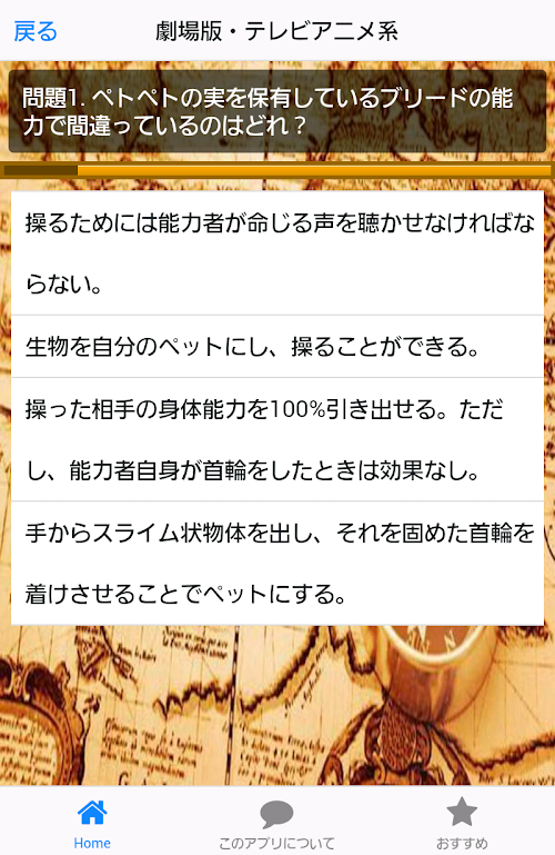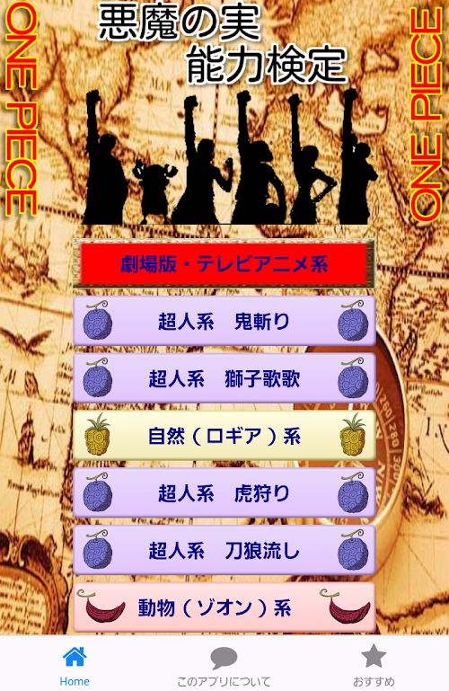ジャンプで大人気の漫画&アニメである「ONE PIECE」に出てくる能力(悪魔の実)に関するクイズアプリです。
