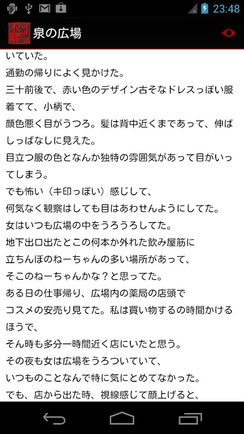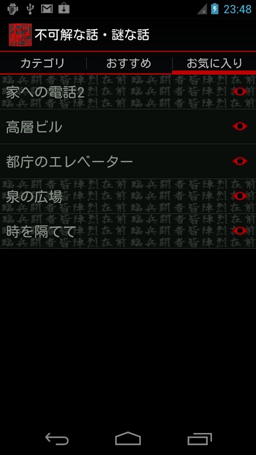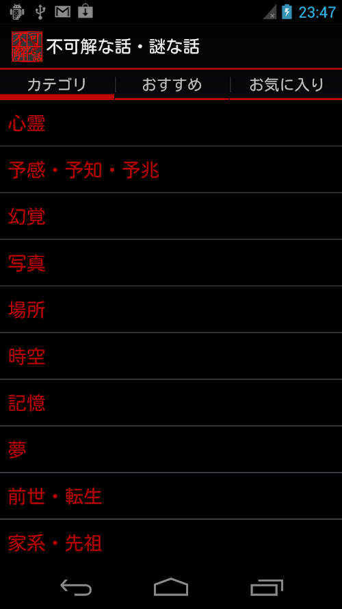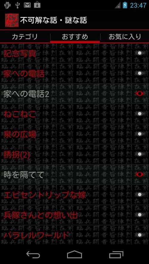 このアプリは世に流れる約15000の怖い話の中から、謎な話・不可解な話を中心に、人力で選りすぐった1988話の怖い話を収録!