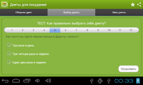 The application will help you select a good individual diet. To choose the most suitable for you diet, answer the test questions.