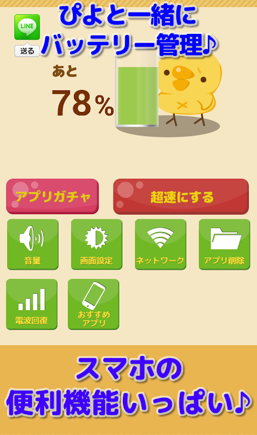 ・電波回復 (電波が入らない時に、ワンプッシュで復活)Together with power saving the battery (battery) of smartphone and Piyo