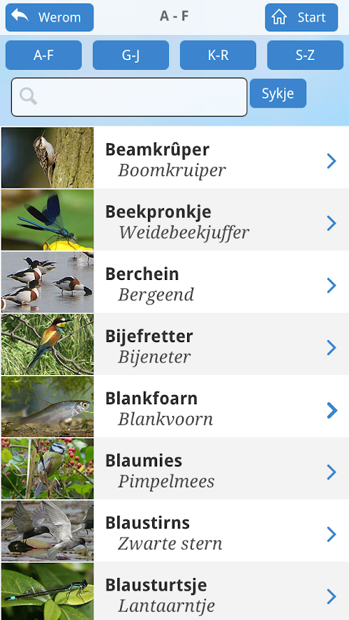 - in unike Frysk/NL en NL/Frysk list fan de sawat 1500 bistesoarten dêr’t op dit stuit in Fryske namme fan bekend is.Dizze app is e-guide, dy't ynformaasje befettet oer 205 bistesoarten dy't yn Fryslân foar komme (fariearjend fan fûgels and sûchdieren oant ynsekten, reptiles, and amfibyen fisken).