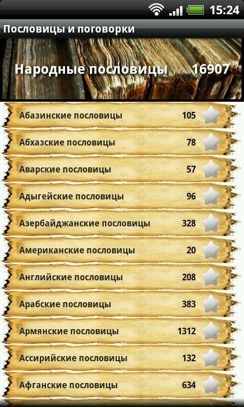 Most convenient collection of proverbs and sayings! A convenient way to turning will enjoy reading Proverbs and where ever you are. When browsing categories can be distinguished favorite category by clicking a star. In this case, the selected categories will fall into the "Featured Categories". Also, when reading the individual proverbs you can click the star to add it to the "Selected proverbs." You can always use the search proverbs, if something is forgotten or simply to find a beautiful and memorable sayings. You can copy your favorite proverb to the clipboard, or share it with your friends and acquaintances. It's enough to make a long press on the proverb, and select the desired action. The application supports a number of widgets for every taste (available in full version). All widgets are decorated in the style of the application and combine convenience and good looks.