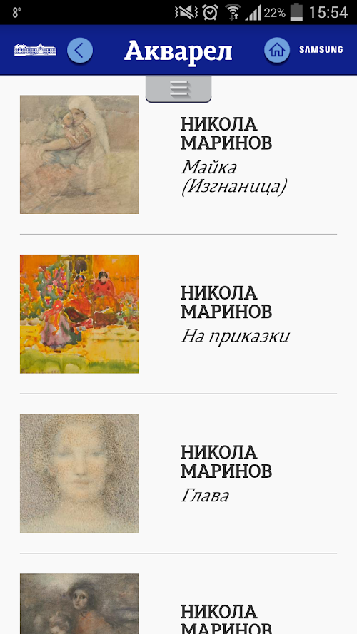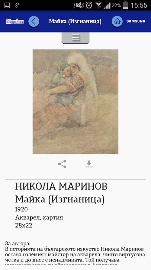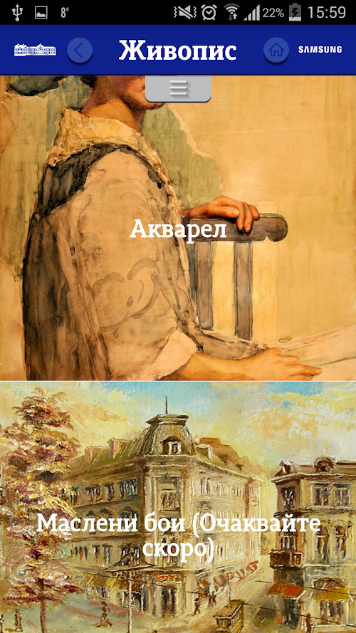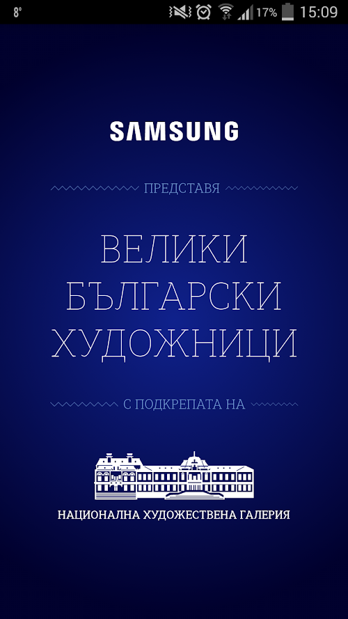 Приложението на Самсунг "Велики български художници“ е дигитална галерия на фонда на Националната художествена галерия. Към момента приложението стартира с дигитализация на Българския акварел от епохата на 20-ти век, като част от тези картини не са били излагани никога поради естеството на акварелната техника. С партньорството на НХГ в приложението ще бъдат добавяни произведения, в т. ч. всички художествени техники, автори и творби с идеята до края на 2015 г. да се дигитализира цялото Национално богатство от фонда на Националната художествена галерия.The application of Samsung "Great Bulgarian Artists" is a digital gallery of the fund of the National Art Gallery. At the time the application starts with the digitalization of Bulgarian watercolor era of the 20th century, as part of these paintings have not been exposed never the nature of watercolor technique . In partnership with the National Gallery in the application will be added works incl.. all artistic techniques, authors and works with the idea of the end of 2015 to digitize the whole national wealth fund of the National Art Gallery.