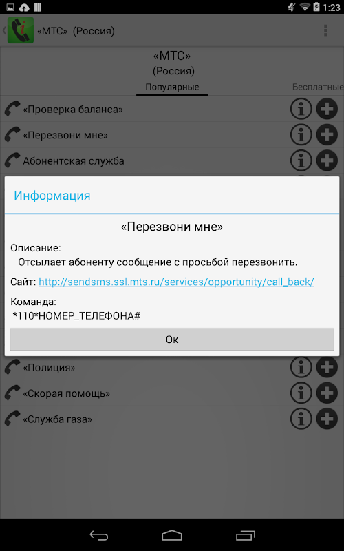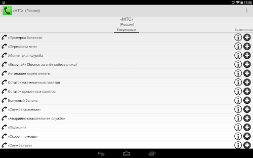 "Мобильный справочник", справочник кодов операторов мобильной связи! Программа позволяет просматривать и использовать более удобно сервисные коды (USSD) сотовых операторов. С помощью программы - Вы можете отправить сообщение с просьбой перезвонить Вам - просто выбрав соответствующий пункт программы и номер из адресной книги. Так же Вы можете добавлять необходимые команды в книгу контактов для дальнейшего, более удобного их вызова.