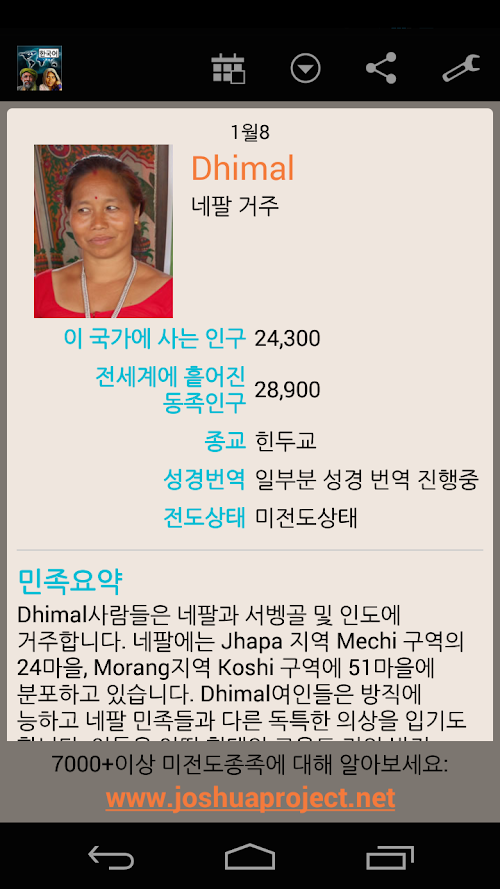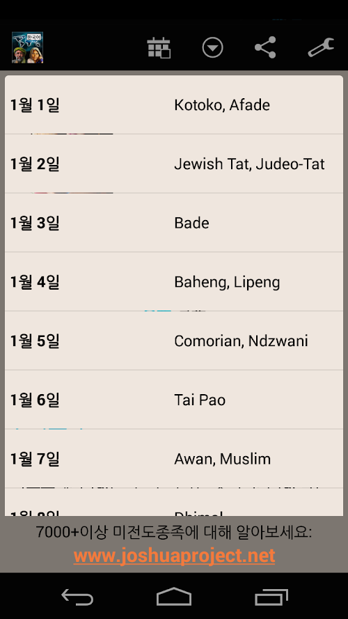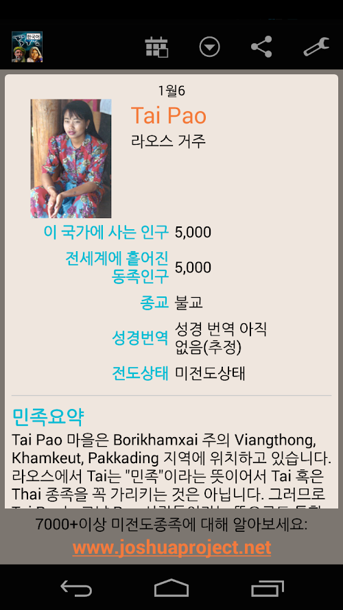 매일매일 한 종족씩, 미전도종족에 대해 기도하는 이 어플은 영문버전이 2014.12월 현재 27,000건 이상 설치(Android 12000 + iOS 14000) 될 정도로 인기가 많은 어플이었습니다. 한글화에 대한 꾸준한 요청과 소망이 견인차가 되고, 또한 자원봉사 번역자들의 도움으로 한글판을 두번째로 출시하게 되었습니다.