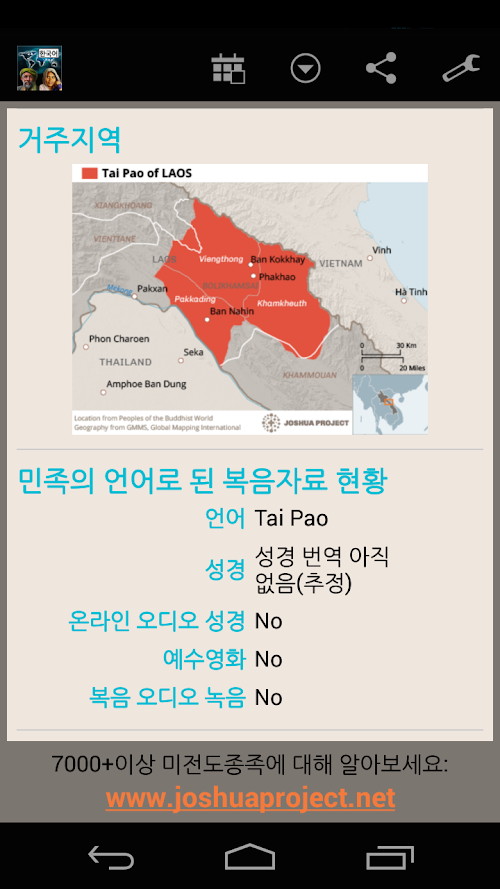 이 어플은 죠슈아프로젝트의 요청에 따라 LightSys 학생들이 Spring Break Code-a-Thon 2012 기간에 제작한 어플입니다. 매일 매일 다른 미전도종족을 위해 기도하며, 많은 다른 미전도 종족을 살펴볼 수 있게도 만들어졌습니다. Developed by Terry “Bacon” Penner and Tumbler Terrall. 한국어 버전은 미국 형제들의 도움을 받아 강희선 (Hison Kahng)형제가 제작하였습니다. 2차 버전의 한국어 번역에는 송은미 자매님과 김아림 자매님께서 수고해 주셨습니다!!