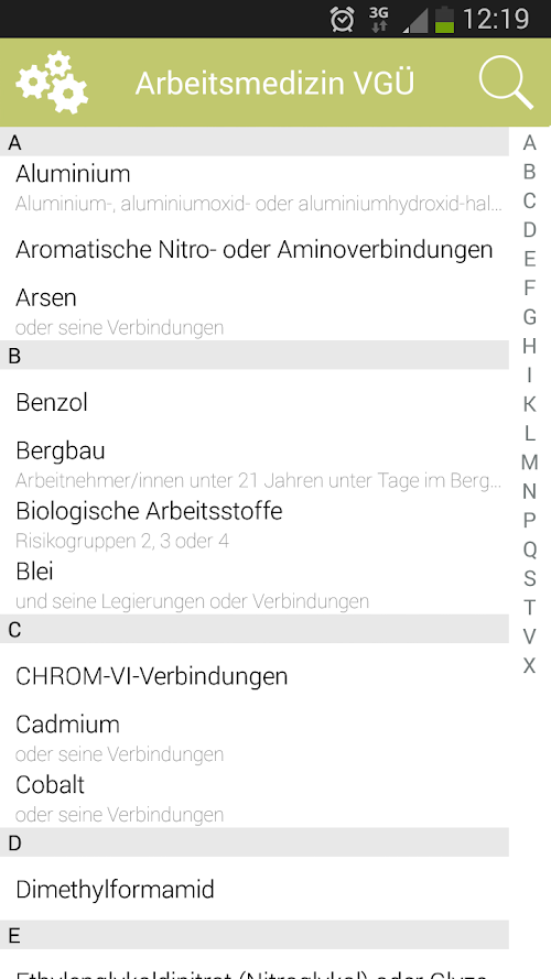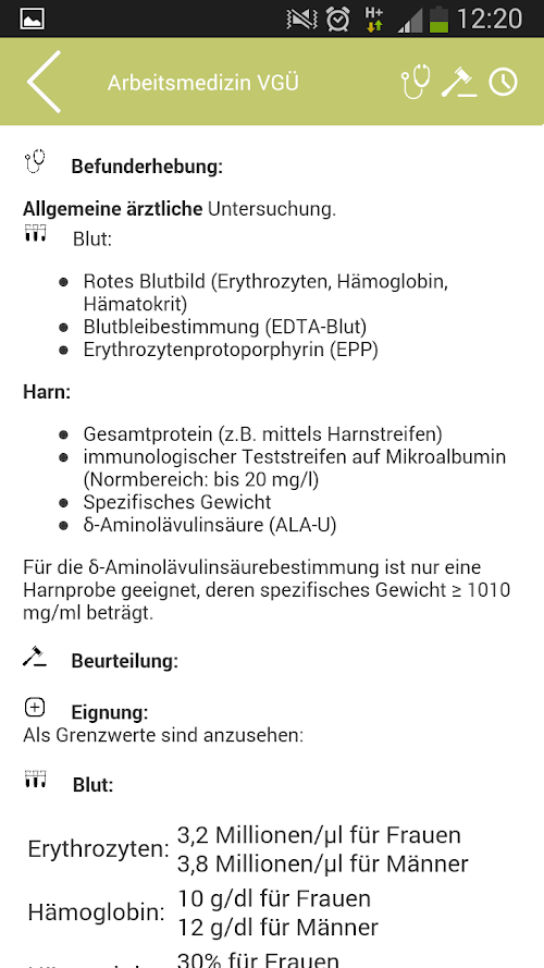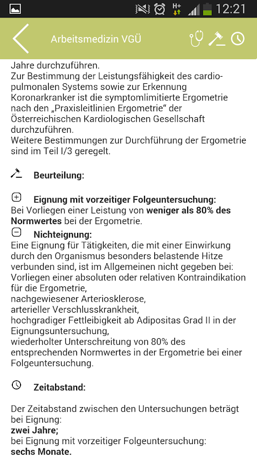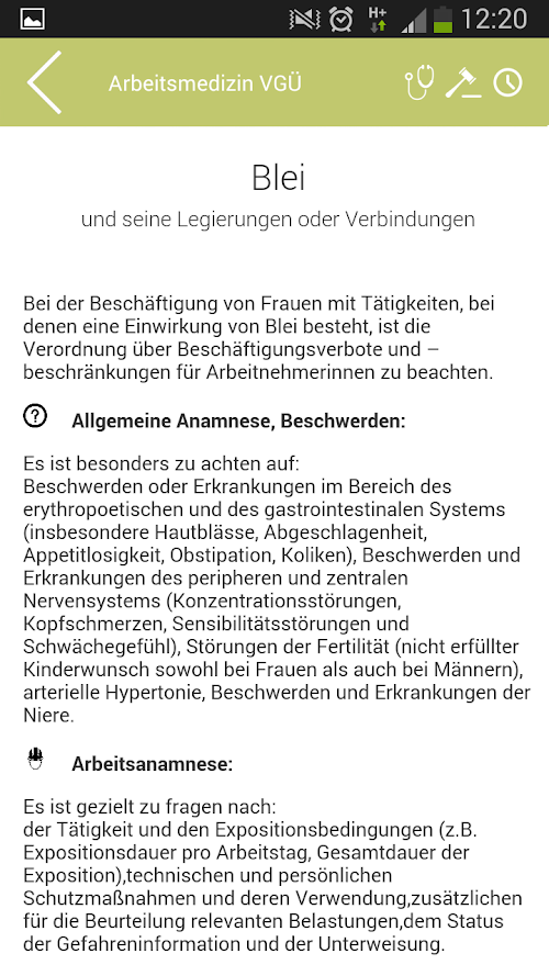 Zu jedem „Arbeitsstoff“ bzw. jeder Einwirkung ist die Anamnese, Arbeitsanamnese, Befunderhebung, Beurteilung inklusive Eignung und Nichteignung sowie der erforderliche gesetzliche Zeitabstand abfragbar.