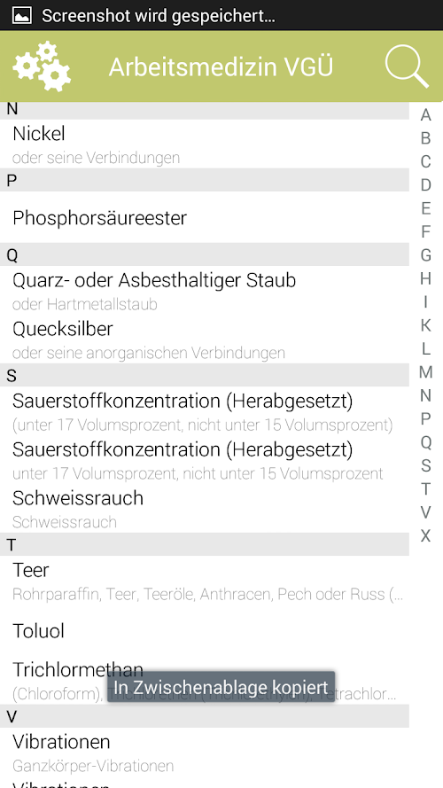 Eine zusätzliche Suchleiste ermöglicht die gezielte Suche nach dem gewünschten „Arbeitsstoff“ bzw. der gewünschten Einwirkung.