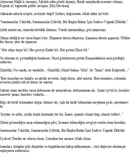 ve bunun gibi nice altın sözler.onh hazırladı osman nuri hoşdoğdu sizin için uyguladı. keyifle okumanız dileğiyle.aşkla kalın dostça kalın.Mevlana'nın dediği gibi.Sözün en hayırlısı, az ve anlaşılır olanıdır."Be the soil in your bosom, you grow roses.