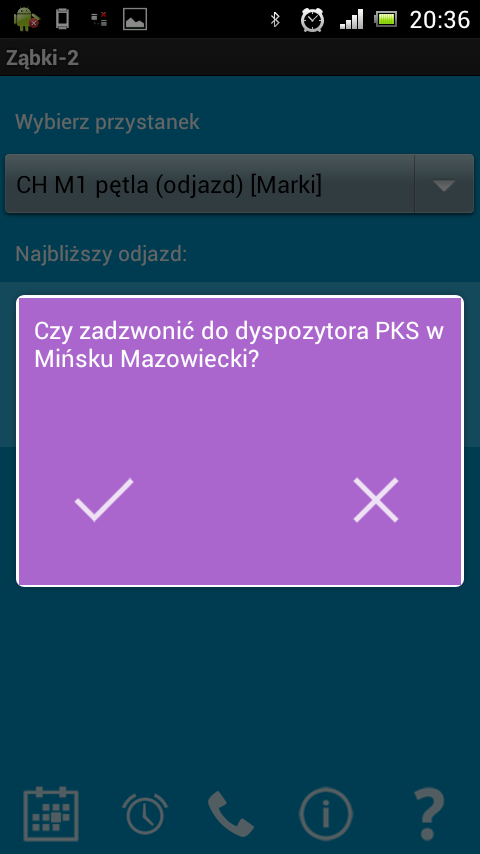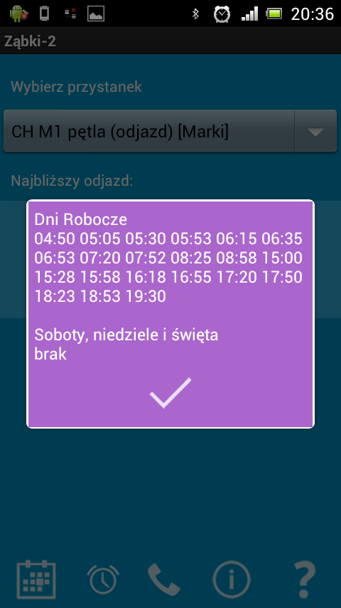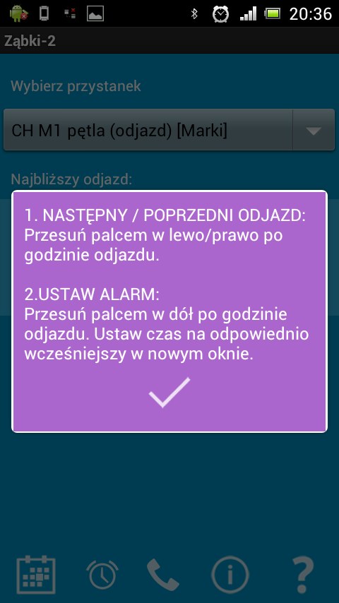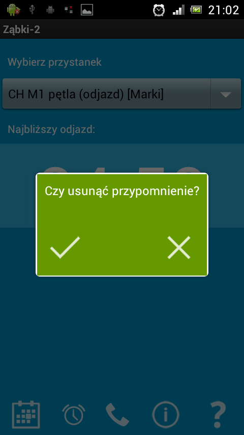 Dzięki aplikacji Ząbki - 2 łatwo ustawisz przypomnienie o godzinie odjazdu. Pozwoli Ci to spokojnie przygotowywać się do wyjścia rano lub spędzić czas bez ciągłego spoglądania na zegarek i kontrolowania czasu. O zbliżającej się godzinie odjazdu zostaniesz poinformowany sygnałem wibracji. Powiadomienie jest też wysyłane na smartwatch Pebble.