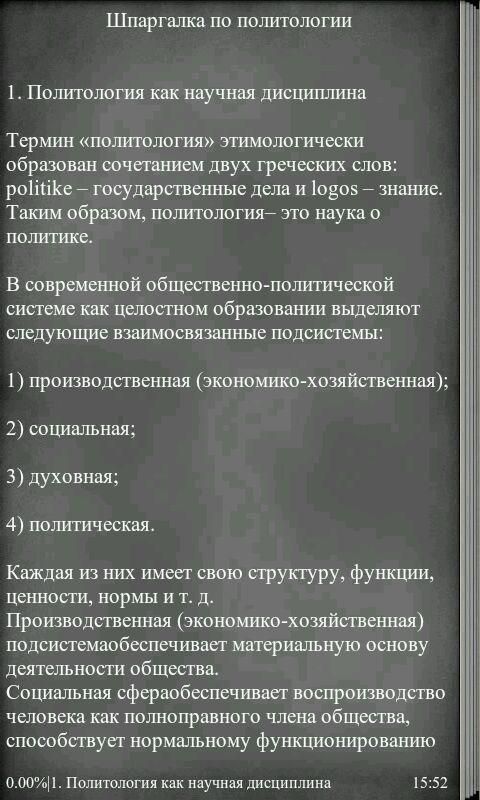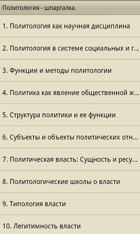 To create this free app to use the book - "Crib in Political Science", which is freely available on the network, the Internet, by Tatiana Shapkarina. All rights reserved.