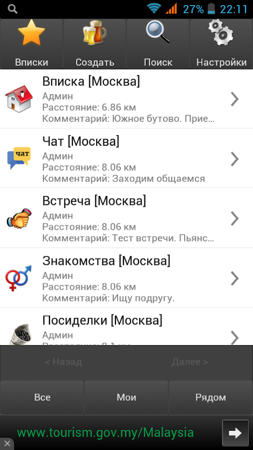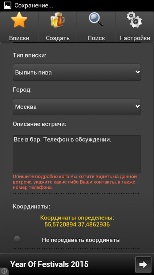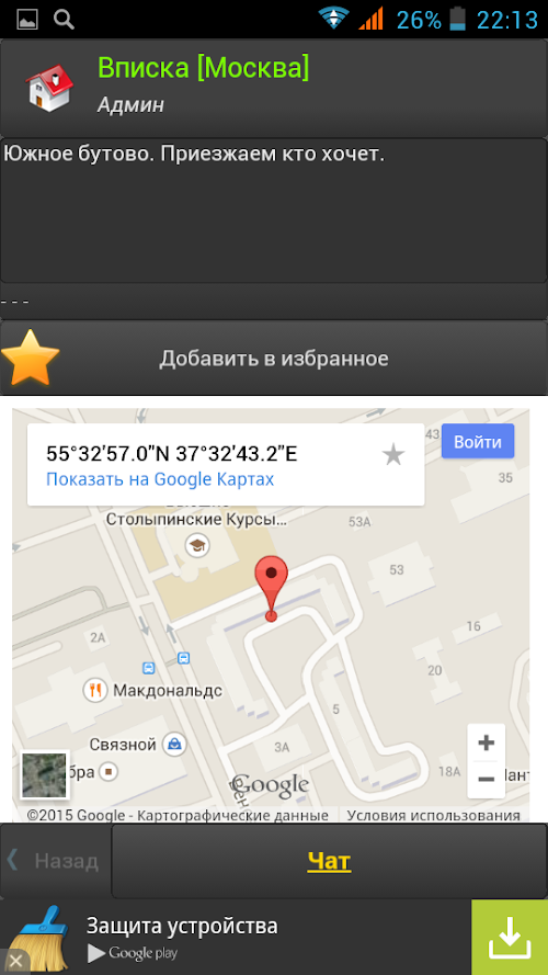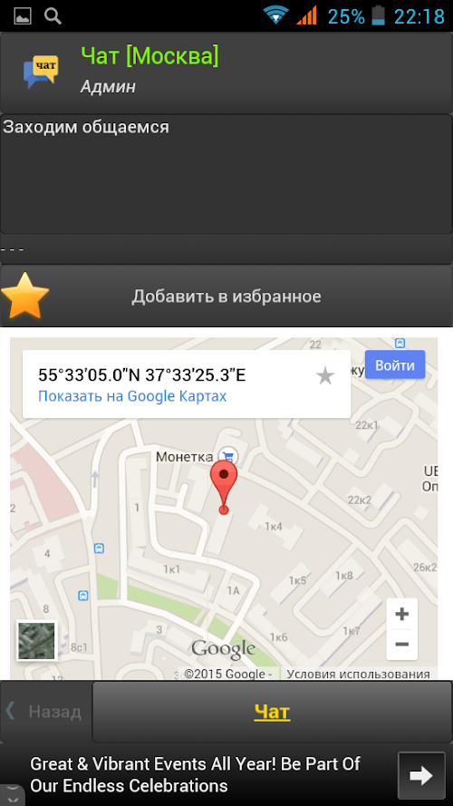 Приложение также может определить Ваши координаты по мобильным сетям и предложить список таких же одиноких людей которые располагаются ближе всего к Вам и создали встречу. Такие встречи можно сразу посмотреть на карте и обсудить в чате.