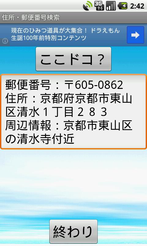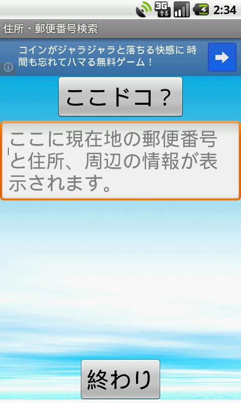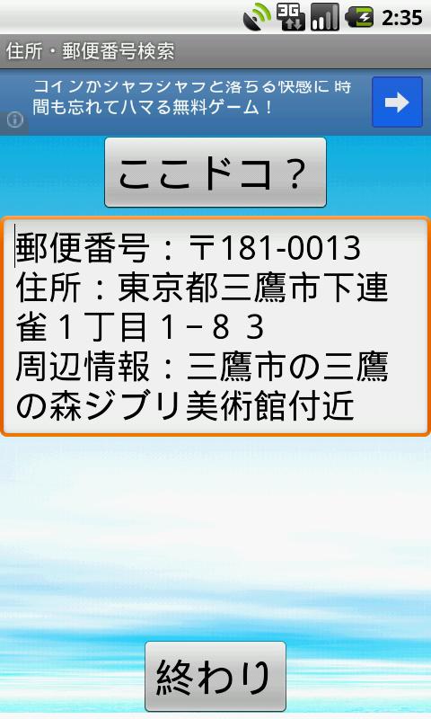 The "address postal code Search You are here", is an app that can display the landmark information zip code and address of the current position, the peripheral at the touch of a button.