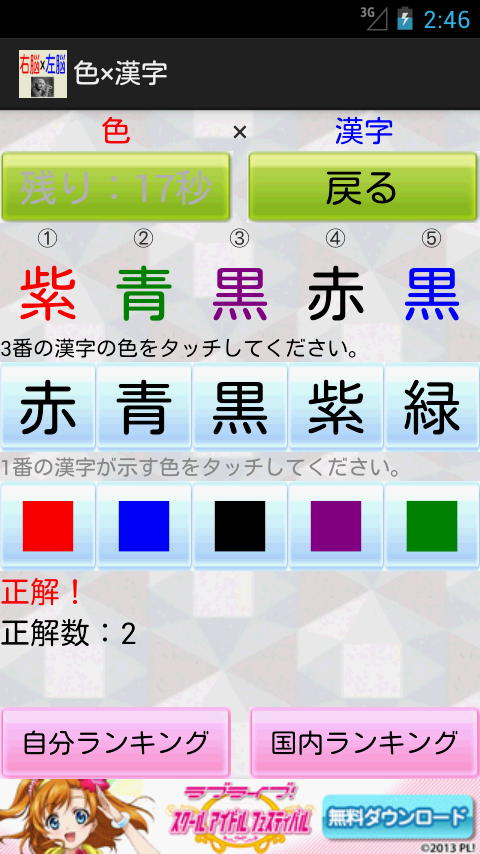 右脳の領域である「色認識力」と左脳の領域である「言語認識力」を連携させて遊ぶゲームです。漢字の内容と漢字の色を混同せずに正しく選ぶことができるでしょうか。