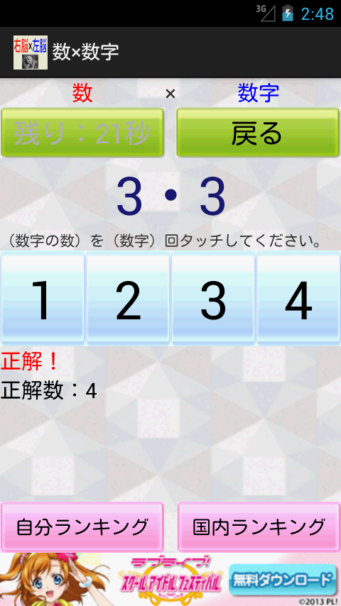 右脳の領域である「数認識力」と左脳の領域である「数字認識力」を連携させて遊ぶゲームです。数字と数字の数を素早く認識してタッチすることができるでしょうか。