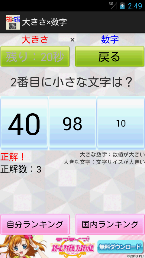 右脳の領域である「空間認識力」と左脳の領域である「数字認識力」を連携させて遊ぶゲームです。数字の文字サイズと数字自体の大きさを瞬時に認識してタッチすることができるでしょうか。