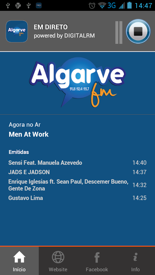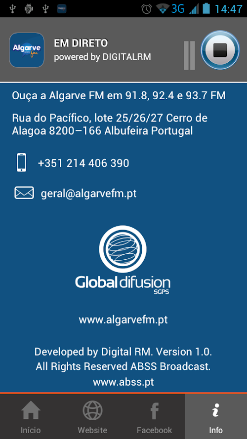 A Rádio Algarvefm é uma rádio portuguesa (que emite a partir do Algarve) do grupo Global Difusion. Com uma programação musical renovada, apostando na música popular brasileira e portuguesa, mantém uma forte ligação ao território onde se insere. The Algarvefm Radio is a Portuguese radio (which emits from the Algarve) Global Diffusion Group. With a renewed musical program focusing on the Brazilian and Portuguese popular music, maintains a strong connection to the territory in which it operates.