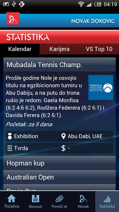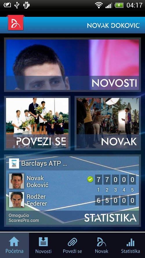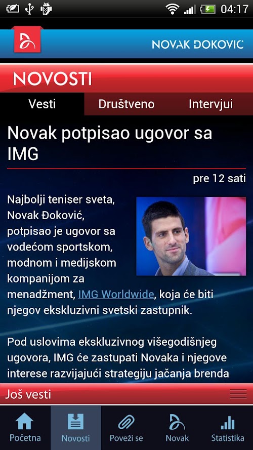 Novakova zvanična mobilna aplikacija ima bogat sadržaj podeljen u četiri osnovna menija: