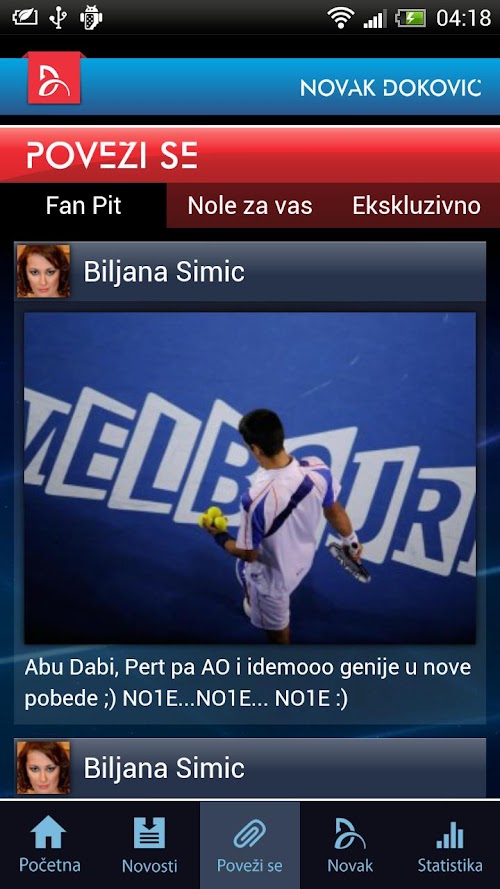 2. Connect - connects you with Nole4U interactive application for questions Novak; As with FanPit section, in which you can submit your content about Novak on his official website. You also get the ability to assume the exclusive signed photos, wallpapers for your phone ...