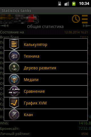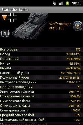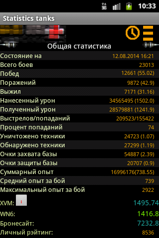 Ну вот вроде все, качайте пишите отзывы и пожелания.It's about the statistics of the player in World of Tanks. If it's just a game to you, and you do not know what percentage of wins, XVM, bronesayt and other incomprehensible words, then this app is not for you. But if the game World of Tanks for you that more and you after each battle tracking your statistics and strive to improve their performance, in your head spinning words bronesayt, XVM, and the like, then you have come to the right place. This application you like. In this application, you can:
