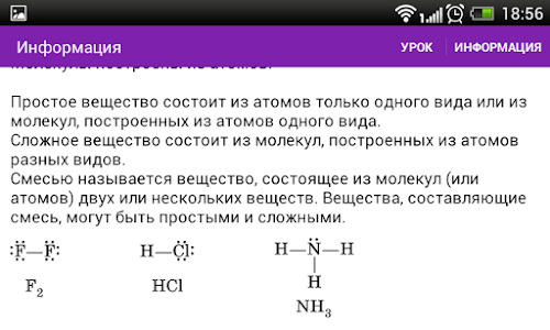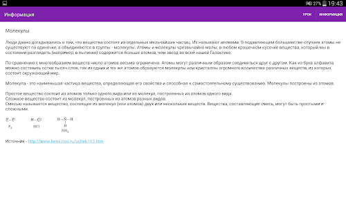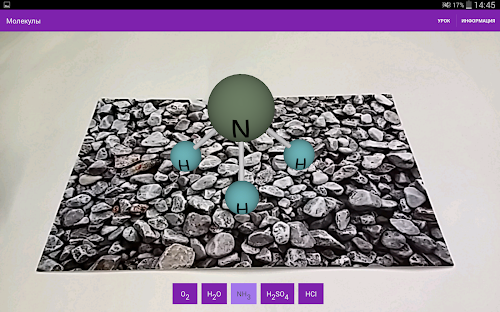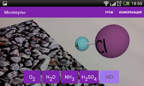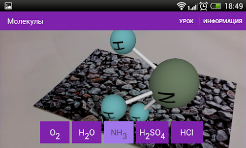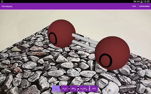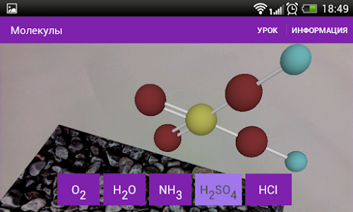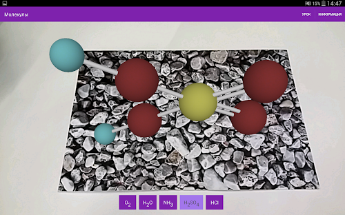 1. Lesson. Allows you to explore augmented reality mode molecular structure of simple and complex substances (O2, HCl, H2O, NH3, H2SO4). Molecule can be viewed from all sides, which will be useful to illustrate teaching materials.