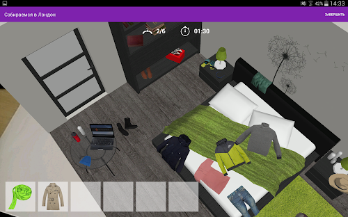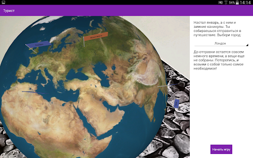Приложение определяет уровень знаний ребенка по теме «Климатические пояса» в формате игры. Задача игрока – выбрать город для путешествия (Сингапур, Алис-Спрингс, Оймякон, Тунис, Черапунджи), после этого собрать в комнате только те вещи, которые пригодятся в поездке. Начальные данные: Ярославль, январь. Все вещи нужно собрать как можно быстрее, совершив минимальное количество ошибок. В ходе игры участник получает баллы. Рекомендуется устраивать рейтинги/соревнования в компании друзей, классе или школе.