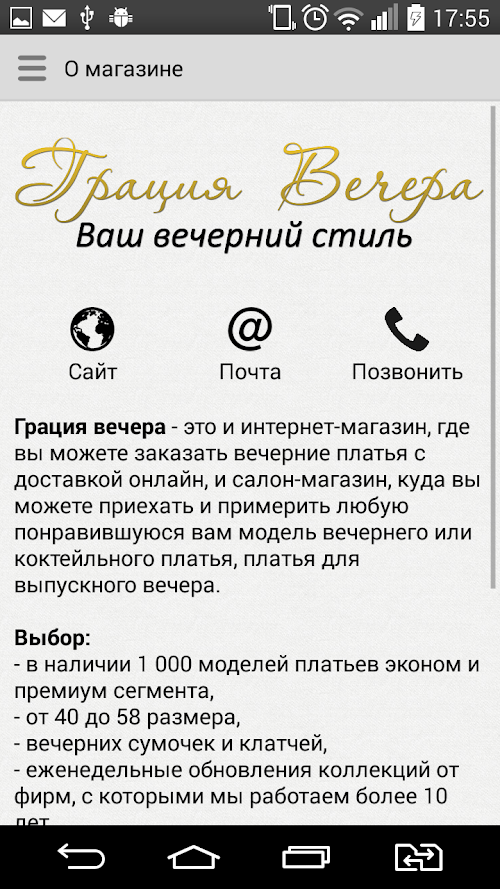 Грация вечера – это и интернет-магазин, где Вы можете онлайн заказать вечернее платье с доставкой на дом, и салон-магазин, куда Вы можете приехать и примерить любую понравившуюся модель вечернего, коктейльного платья или платья для выпускного вечера.