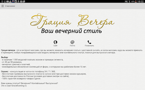 Grace evening - this online store where you can order online evening dress with home delivery, and boutique, where you can come and try favorite model of the evening, cocktail dress or a dress for the prom.