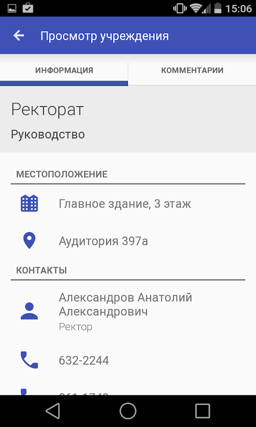 Просмотр информации об учреждении: местоположение, контакты, время работы