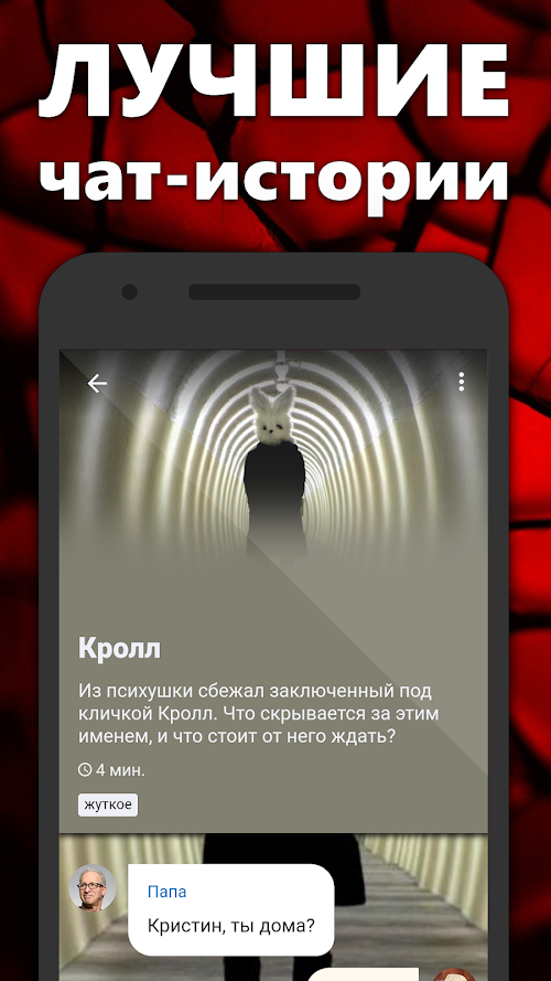 Пишите истории про любовь, страшилки или что угодно! После публикации история сразу же станет доступна всем через поиск в приложении. А ещё вы сможете поделиться ссылкой на свою переписку с друзьями или отправить ее в сообщество ВК https://vk.com/historyapp. ЛУЧШИЕ РАССКАЗЫ БУДУТ ДОБАВЛЕНЫ В КАТАЛОГ, где их увидят тысячи читателей! Авторы историй, опубликованных в Каталоге, получают вознаграждение монетами сторис за каждый просмотр пользователями рекламы при чтении их историй!