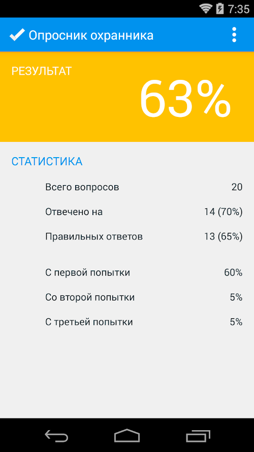 After or during the training can learn the result of examination. Which contains data on the number of questions were answered, the number of correct answers, and so the statistics on the number of attempts made in the answers.