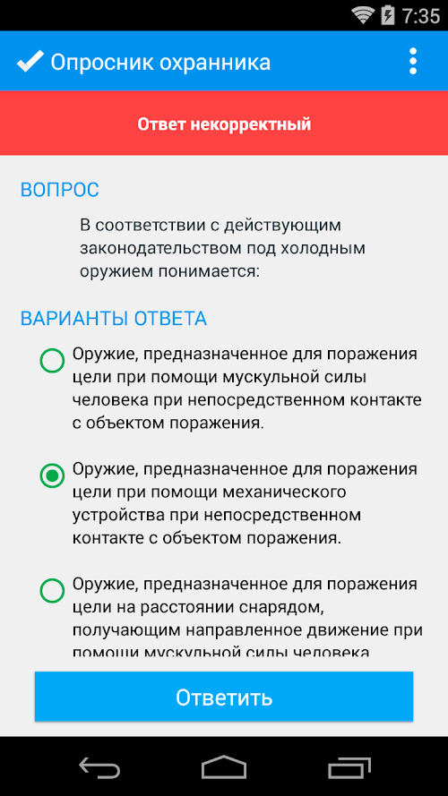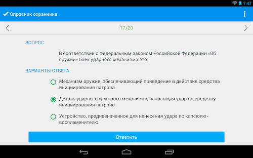 При каждом новом запуске приложения «Опросник охранника» ответы на вопрос меняют свое положение в списке.Annex to test theoretical knowledge workers security units of OJSC "Gazprom", subject to a periodic check on suitability to actions in the conditions associated with the use of firearms and special equipment.