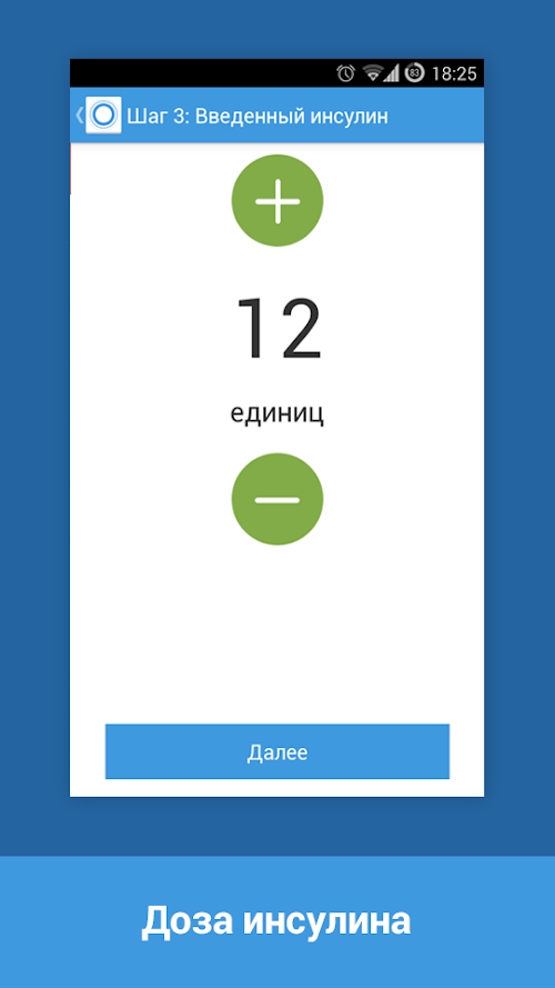 3 шаг: приложение рассчитает для Вас необходимую в это время суток дозу инсулина, которая также может быть скорректирована вручную.