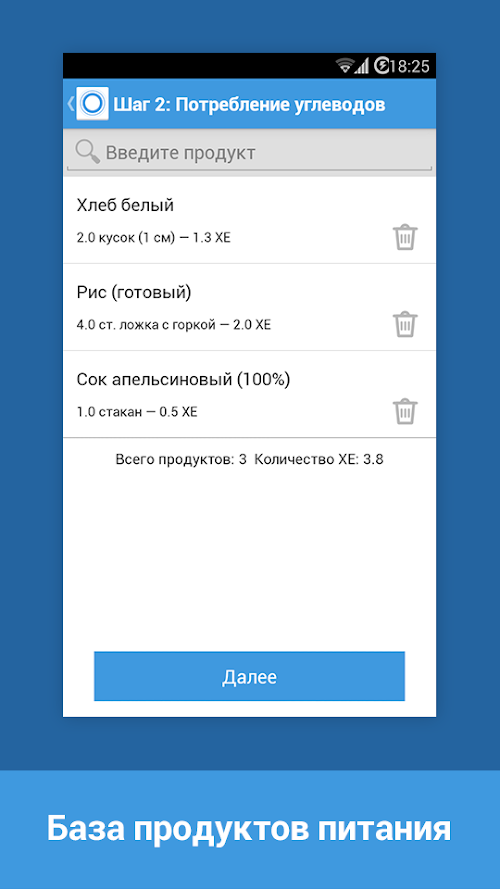 2 шаг: введение потребляемых Вами углеводосодержащих продуктов из удобной базы продуктов. Также приложение содержит удобный способ измерения их количества. Вы можете указать вес продукта, если это известно, или примерное количество, которое можно определить "на глаз" (например, жидкость в стаканах, хлеб в кусках и т.д.). Если база продуктов не содержит потребляемый Вами продукт, то его можно ввести вручную, указав количество содержащихся в нем углеводов (хлебных единиц);