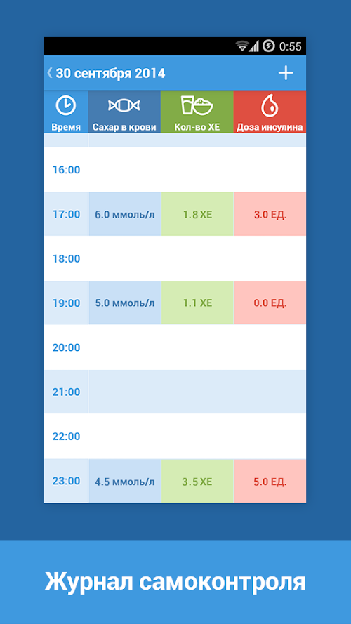 Приложение Диабет создано для ведения дневника контроля и расчета дозы инсулина при инсулинозависимом диабете. С его помощью Вы сможете получить расчет необходимой дозы инсулина, избежать приступов гипоглейкемии, вести дневник питания, контролировать уровень глюкозы в крови, а также следить за суточной нормой инсулина. Приложение поможет Вам не только поддерживать норму глюкозы в крови, но и контролировать свое питание и вес. Также в приложении существует возможность удобного экспорта данных для внешнего контроля лечащим врачом и предоставления ему необходимой информации Вашего образа жизни с целью корректировки нужного именно Вам коэффициента инсулина.