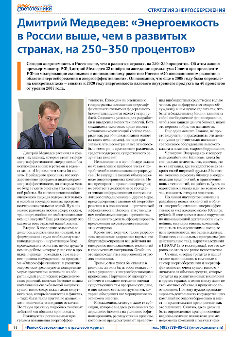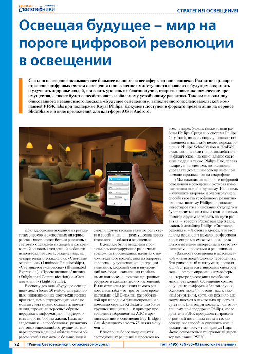 The uniqueness of the journal "The market lighting fixtures" that quickly edition provides the reader with a purely professional materials relating to both Russian and international lighting market as a whole and its individual areas, taking into account not only the latest scientific and technical achievements in the technology industry, but also in combined with market research showing real change conditions.