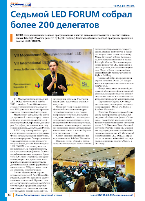 Журнал является компетентным советником в области современной светотехники как для руководителей компаний, так и для проектировщиков, архитекторов, инженеров и специалистов по продажам.