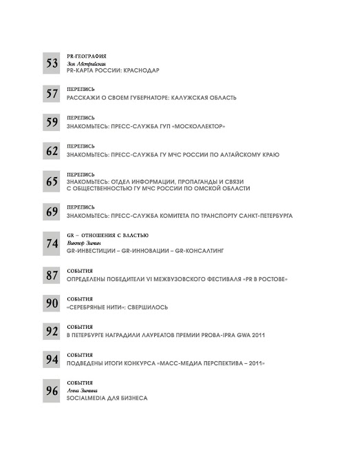 Among the topics of the magazine: the experience of the press services in different sectors, the connection to a negative publications, working with community organizations as part of the public relations process, promotion of territories - the experience of successful campaigns, creative techniques for press conferences and Briefing, the aspects of social networking , PR for a small budget, the corporate media, intra-corporate public relations, reputation management, modern piartekst, shaping the image of the head as an expert for the media and much more.