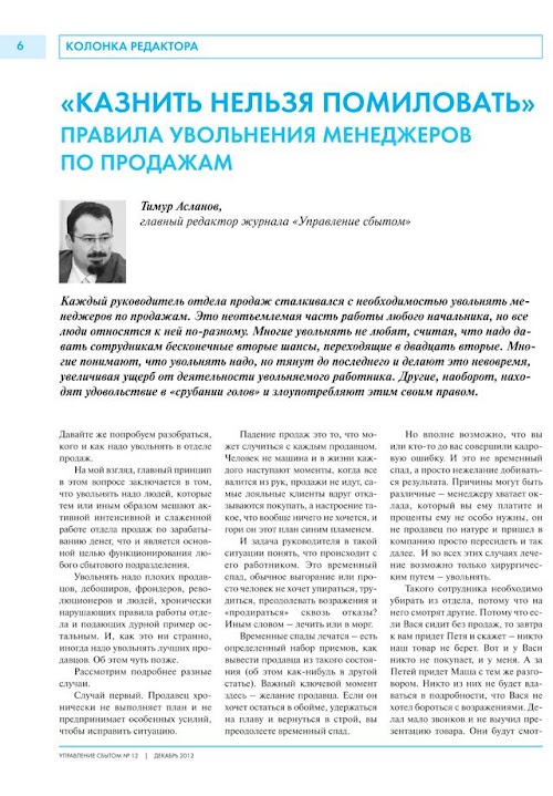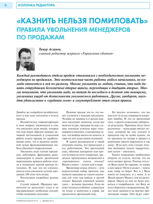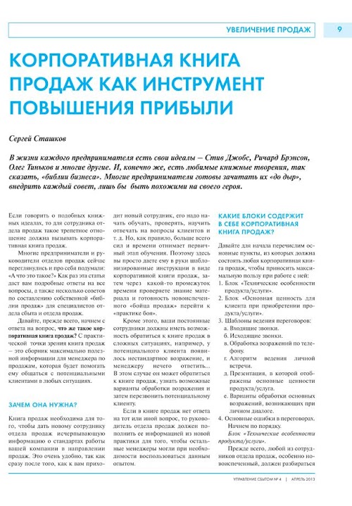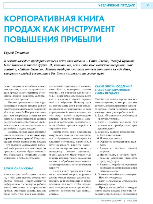 Десятки руководителей, отвечающих за продажи в своей компании, делятся на страницах журнала своим актуальным опытом в вопросах поиска и найма персонала продаж, мотивации продавцов, поиска и развития новых сбытовых каналов, увеличения объема продаж, техниками удержания и возвращения клиентов, ресурсами увеличения продаж во время сезонных спадов, секретами работы с дебиторской задолженностью, приемами борьбы с выгоранием продавцов и многим другим.